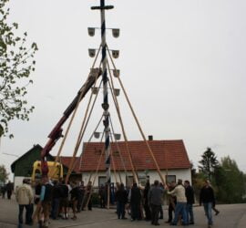 Die Eichenlaubschützen stellen zusammen mit den anderen Vereinen den Maibaum in Haunwang auf.