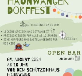 Am 3. August 2024 ist es endlich wieder so weit: Das Haunwanger Dorffest findet statt! Und das Beste daran? Dieses Jahr feiern wir erstmalig an einem Samstag! Das bedeutet mehr Zeit zum Feiern und weniger Stress am Sonntag. Die Feuerwehr […]