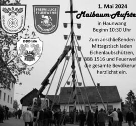 Mai 2024 Maibaumaufstellen in HaunwangBeginn 10:30 Uhr Zum anschließenden Mittagstisch laden Eichenlaubschützen, BBB 1516 und Feuerwehr die gesamte Bevölkerung herzlichst ein. Wir unterstützen bei den Arbeitsdiensten, Einteilung erfolgt durch die FF Haunwang.